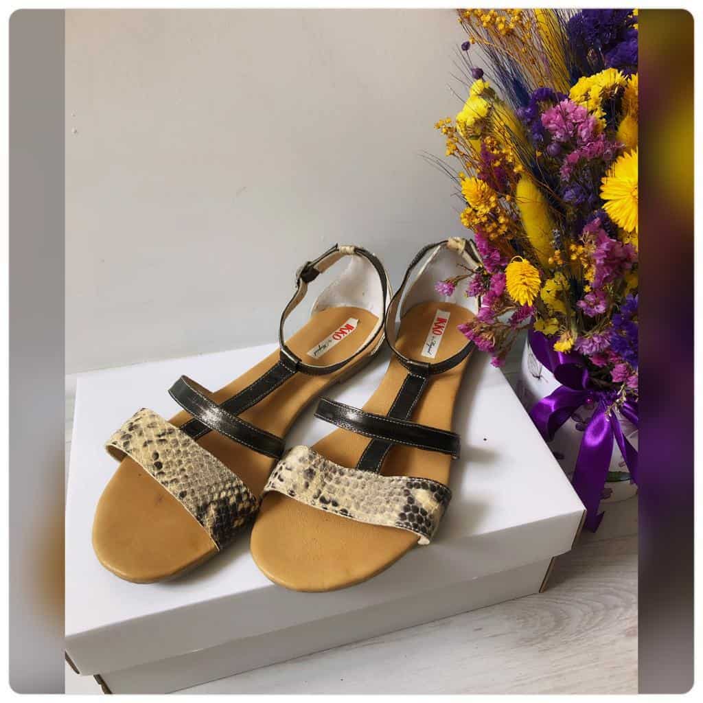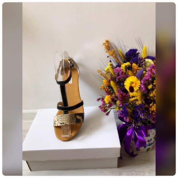 Sandale dama, din piele, captusite cu material sintetic tip poliuretan. Talpa este din cauciuc termorezistent, are o buna aderenta la sol, iar fata este fixata de talpa prin lipire. Si fixeaza bine de picior datorita cataramei late si sunt potrivite pentru orice tinuta casual, lejera, de vara. Se intretin cu crema la culoare sau carpa umeda.